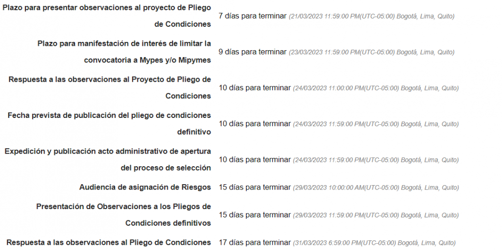 En ese documento, que se encuentra más detallado en el SECOP II, existe una sección que especifica el paso a paso con las fechas de realización, como se ve en la siguiente imagen.