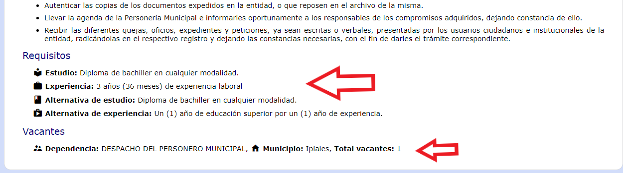 Por último, al final de la ventana, podrás consultar los requisitos de estudio y experiencia que debes cumplir para postularte al empleo que elegiste y las alternativas a esos requisitos. Además, podrás ver la dependencia y la ciudad donde se oferta la vacante.