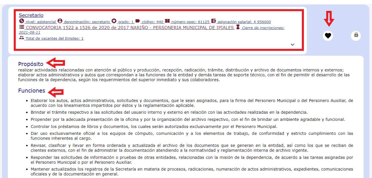 Además, podrás consultar el propósito del empleo y las funciones que tendrás que realizar. Recuerda que si te gusta un empleo, pero quieres seguir mirando las demás ofertas sin perderlo de vista, puedes guardarlo haciendo clic en el corazón que se encuentra en el lado derecho de la pantalla. Este se guardará solo si ya te registraste en el SIMO.