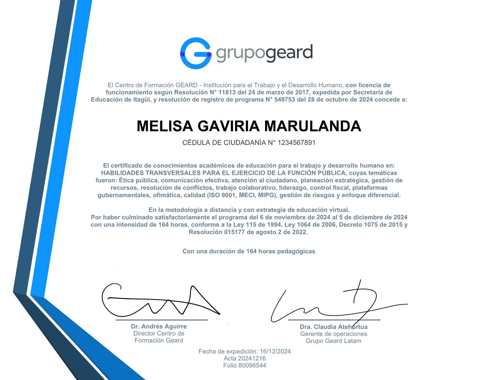 - Entidad que otorga el certificado: Centro de Formación GEARD, institución para el Trabajo y Desarrollo Humano según resolución 11813 del 24 de marzo de 2017
