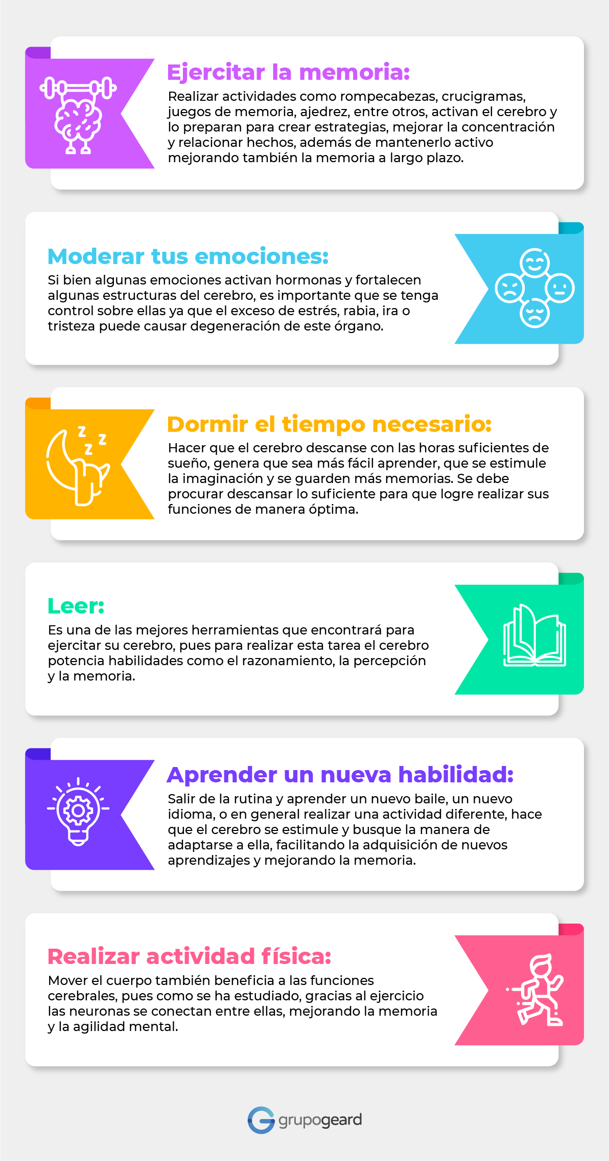 Para enseñarte esta información, preparamos una infografía en la cual podrás encontrar una serie de consejos que tenemos para que lleves a cabo y estimules tu cerebro de tal manera que puedas mejorar sus funciones.