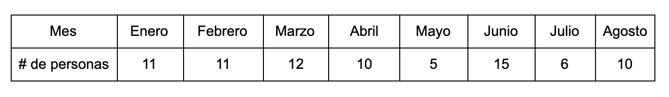 En un campamento de expedición en el Amazonas se lleva el registro del número de personas con dengue por cada mes, la información es mostrada en la siguiente tabla: